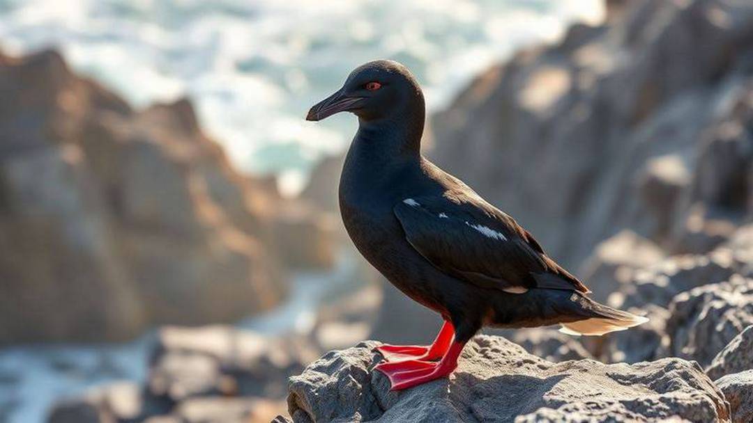 Le comportement près des côtes : Contrairement à d'autres oiseaux marins qui préfèrent le large, le Guillemot à miroir reste près des côtes. Il plonge pour se nourrir dans des eaux peu profondes, souvent près des fonds marins. Observez-le nager sous l'eau où ses taches blanches et ses pattes rouges le rendent étonnamment visible depuis la surface.
