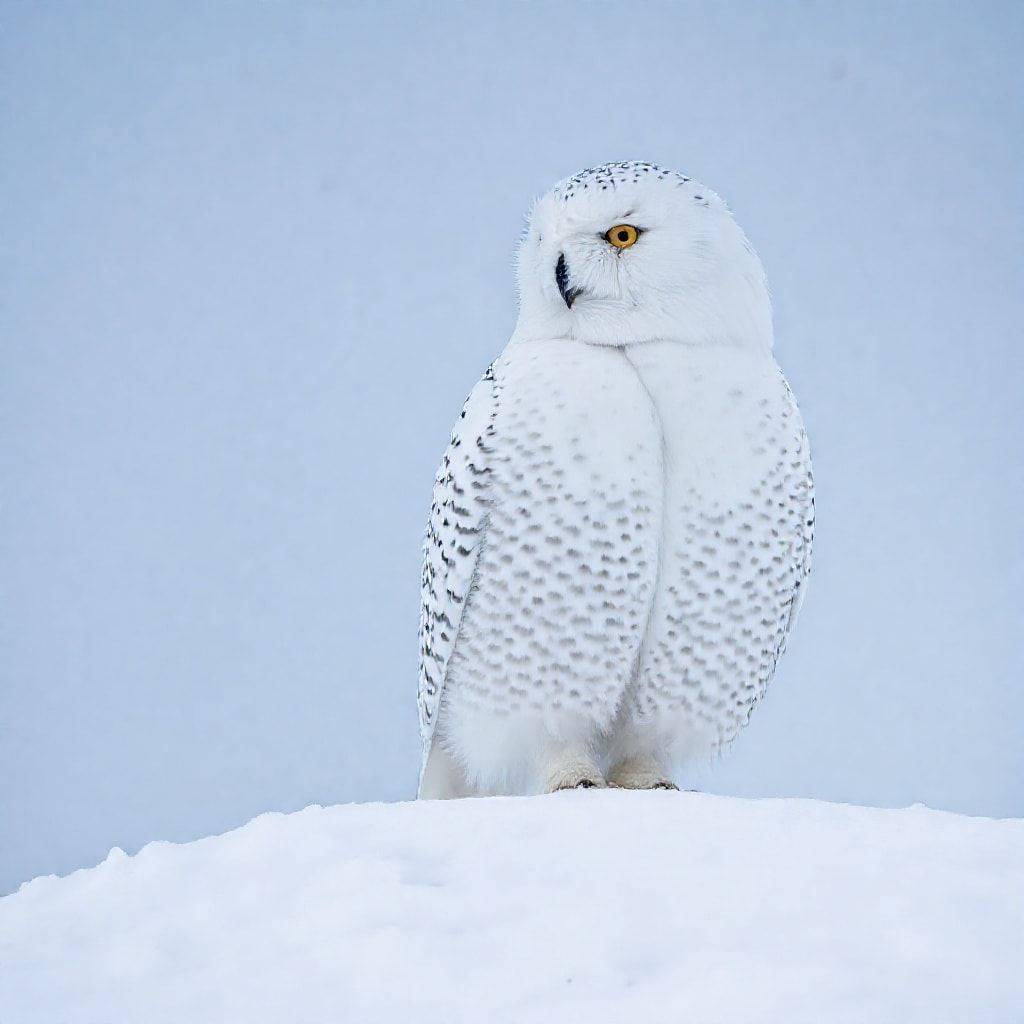 The Snowy Owl (Bubo scandiacus) is the only owl in America larger than the Great Horned Owl. It is recognizable by its predominantly white plumage (especially in males) and yellow eyes, but it lacks ear tufts. It is primarily associated with Arctic and subarctic habitats.
