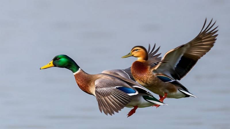 The Mallard is a medium-sized waterfowl; the male is famous for its iridescent green head, white collar, and brown chest, while the female has cryptic mottled brown plumage. Both sexes have a blue-violet speculum bordered with white. It has a robust body, a broad bill, and orange webbed feet.