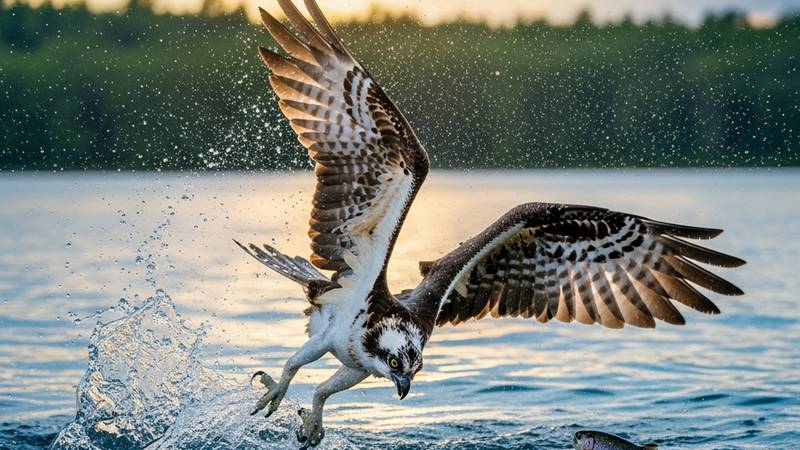 Pay attention to the dive: This is the key moment! When it spots prey, it may hover briefly before diving, talons first, and disappearing almost entirely beneath the water's surface in a large splash. It then emerges with the fish, which it reorients head-first to reduce air resistance.