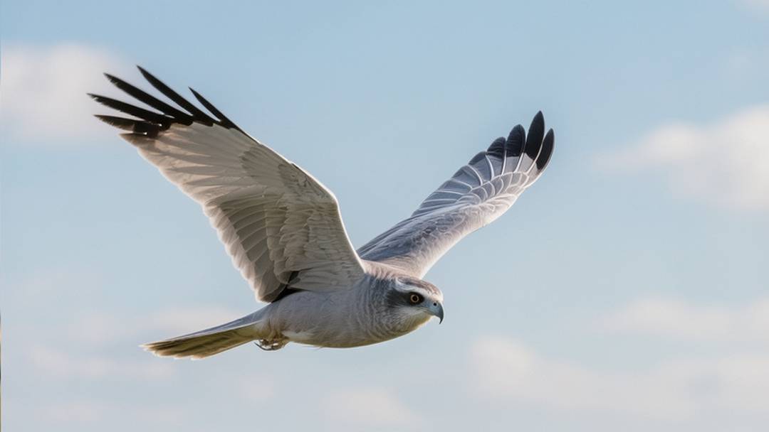 Vol gracieux en "V" : Cherchez ce rapace en vol bas au-dessus des champs ou des landes. Il a une silhouette très élancée et tient souvent ses longues ailes étroites en forme de "V" prononcé. Son vol est léger et souple, comme s'il glissait sur l'air.