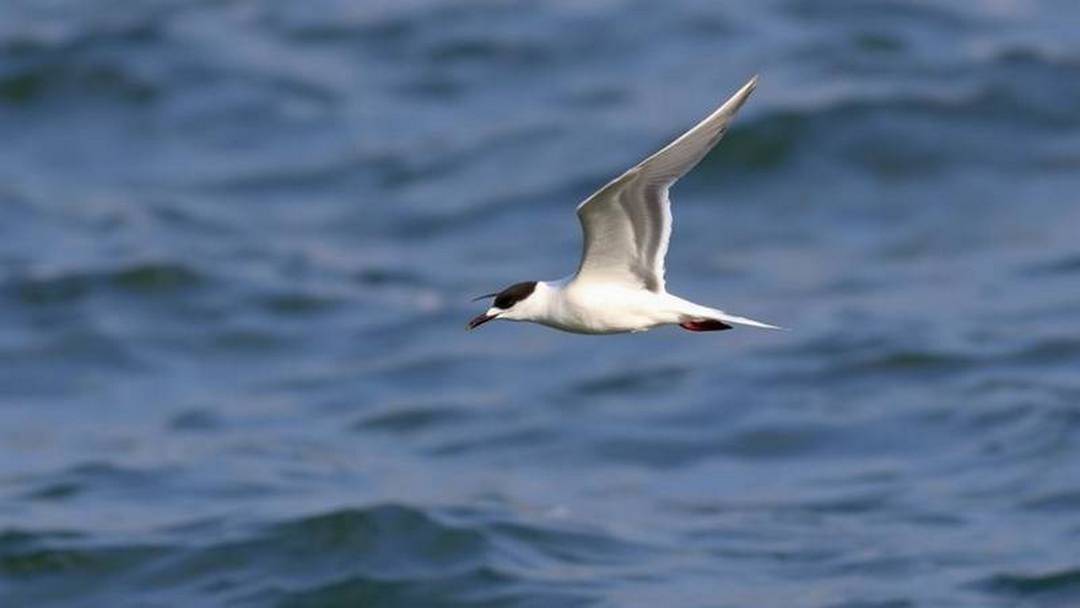 Breeding Plumage (Summer): In summer, it has a full black cap, much like a Black Headed Gull, a blood-red bill with no black tip, and short, dark red legs. Its body is pale grey, with white cheeks that contrast with the black cap. The long, forked tail streamers often extend beyond the wingtips when the bird is perched.