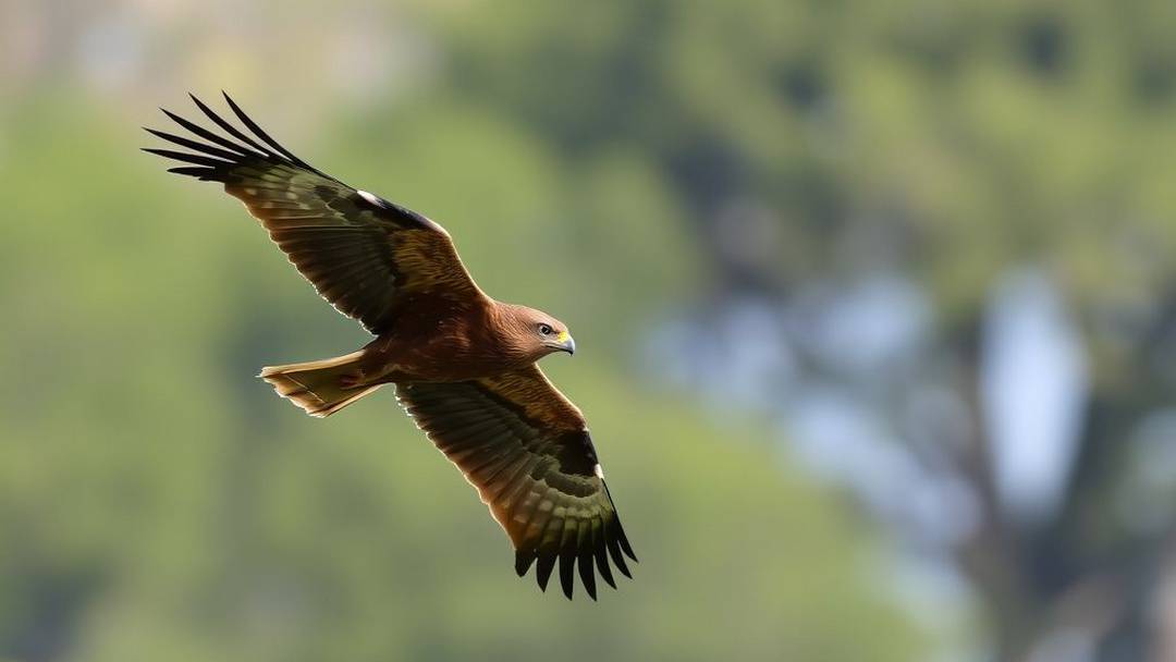 The Black Kite is known for its dense and predominantly dark brown to chocolate brown plumage. Adults often have a lighter head. Its tail is V-shaped, slightly forked, and it may show a creamy-brown patch under the wing at the primary flight feathers.