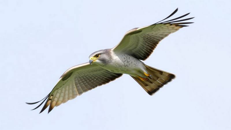 Beak and Legs: It possesses a hooked, robust, and relatively small bill for a raptor, bluish at the base and black at the tip, with a yellow cere. Its legs are long, slender, and yellow (or tinged with orange), ending in powerful talons with long, thin toes, perfectly adapted for catching birds.