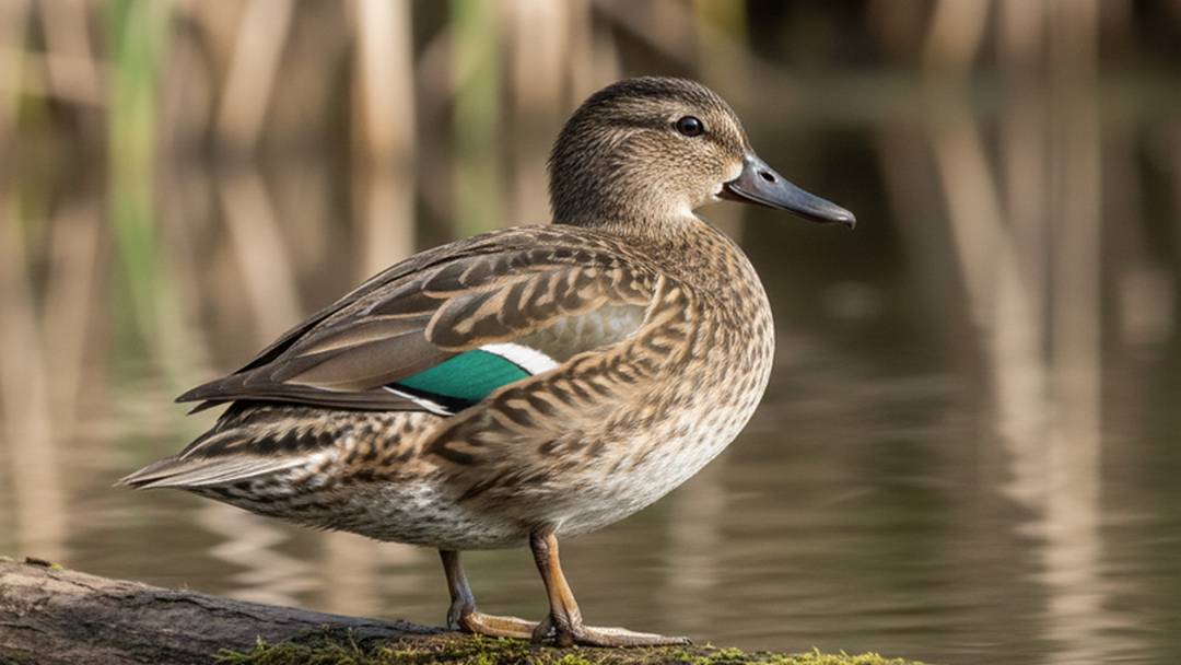 Female: Mottled brown overall, very similar to a female Mallard but much smaller. The best identification feature is the bright metallic green speculum (wing patch) bordered by white, often visible even when swimming.
