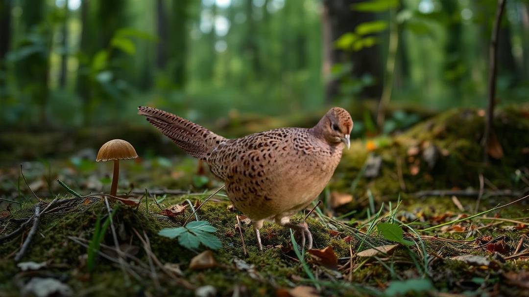 Female plumage: The female is predominantly reddish-brown, finely barred with black over its entire body, which provides excellent camouflage in the undergrowth. Her tail is significantly shorter and less ornate than the male's. She lacks the golden crest and orange ruff. The beak is grayish, and the legs are yellowish.